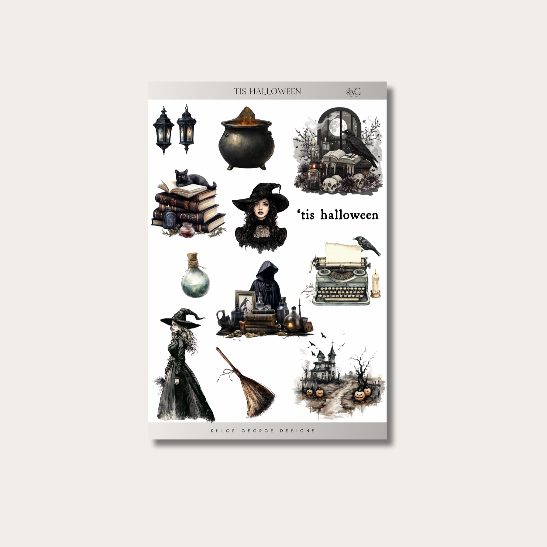 Embrace the magic of the season with the 'Tis Halloween sticker sheet! These vinyl stickers are witchy, dark, and perfectly spooky, with a hint of enchantment. Featuring mystical designs like witches, potions, and more, they're perfect for adding a touch of Halloween magic to your journals, planners, or anywhere you want to get into the spooky spirit. Durable and versatile, they're a must-have for any Halloween lover!